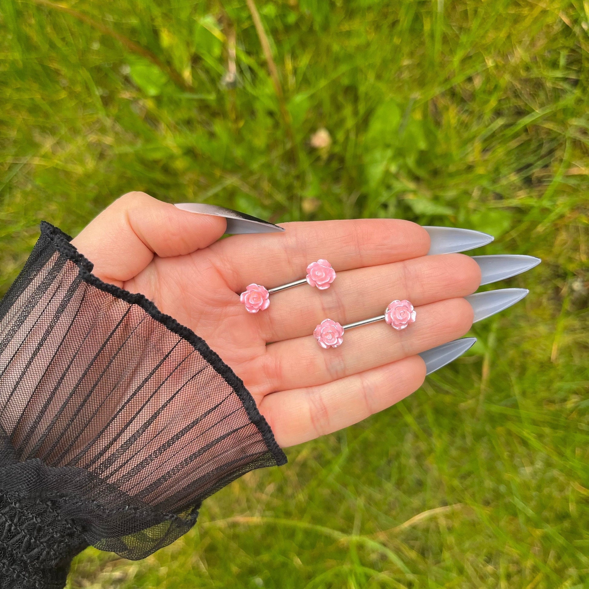 Rose Nipple Barbells, Pink Nipple Piercings, Girly Cute Nipple Bars, Nipple Jewelry, Surgical Steel Body Piercing Jewelry 1.6mm 14g